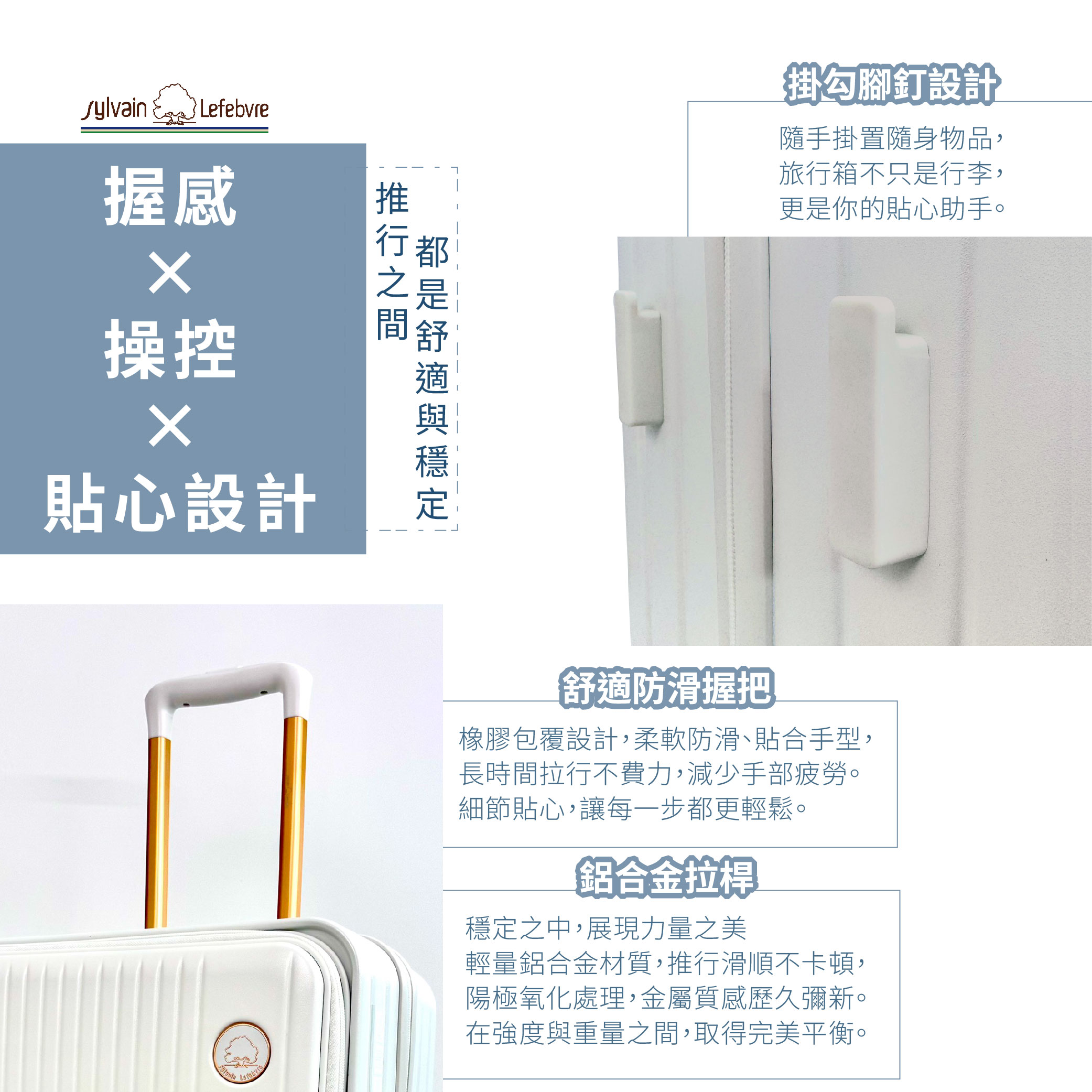 拉桿:多段式鋁合金拉桿設計,符合人體工學把手好握好拉,可自由調整適當的拉桿高度。