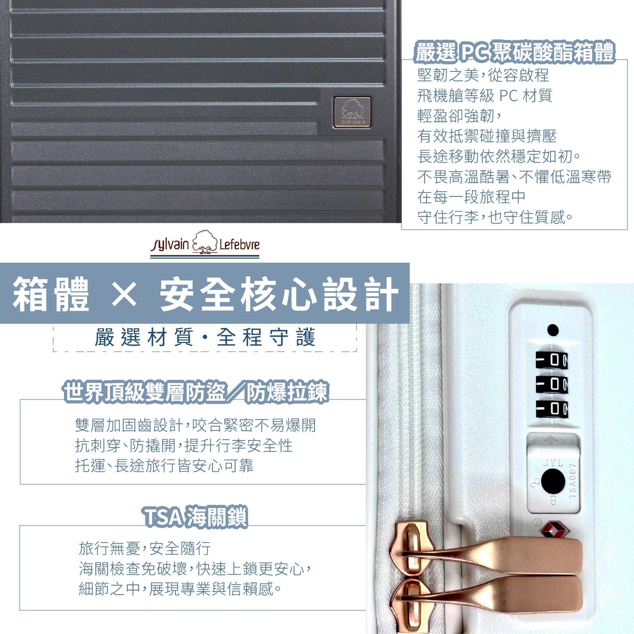 鎖頭:拉鍊框按壓鈕輕鬆好開,全球通用TSA國際海關密碼鎖通關簡單、快速,內嵌式設計鎖頭、與專利安全雙層防爆拉鍊,不易遭受外部撞擊受損或爆開。